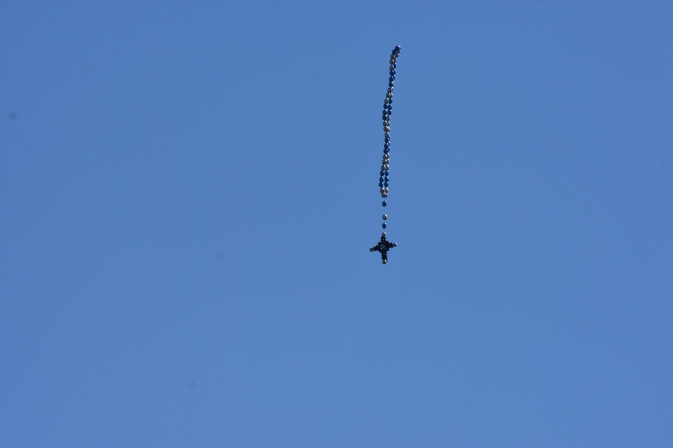 The Cross and Rosary perfectly balanced and seemingly guided by an unseen hand