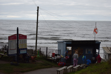The backdrop to the scene beyond the bay the ruins of Scarborough Castle and the rows of traditional seaside buildings of penny arcades and fish & chip shops the diverse pleasure and love of the British Seaside, all year round from season to season come rain or shine, the people of Britian the old and new and their affinity to Sea.