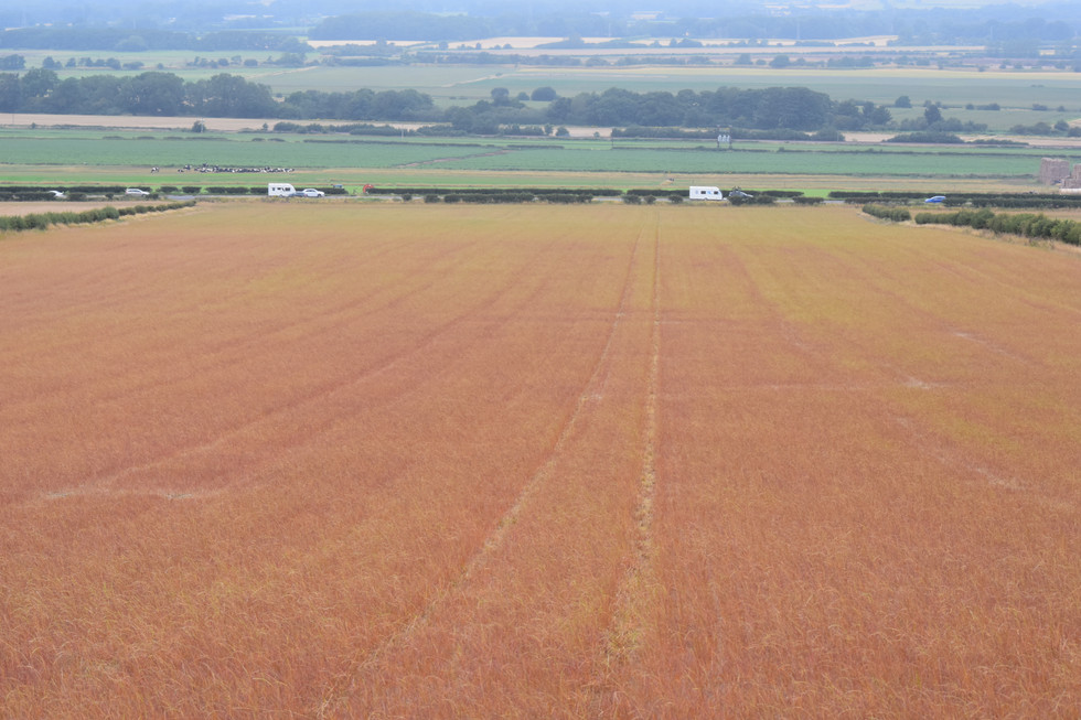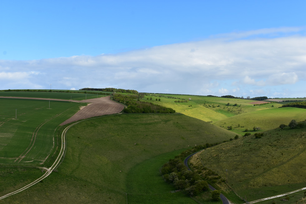 North of the Wolds as the pathway and ridgeline arches East to Sea, the declination of the Wolds is at its steepest, from the high vantage point of the Wolds top running from Winteringham to Staxton, below is revealed the long and narrow Vale of Pickering which extends from the foot of the Wolds West to the Howardian Hills to the incline of the North Yorkshire Moors and the Cleveland Hills which rise from the North side of the Vale forming the visible horizon of the landscape. To the East seaside towns the occasional glimpse of the endless blue sea. The land here once a great glacial lake now resembling a patchwork quilt of Britain, of yellow and golden farmed fields & green forest, the Vale alive with seemingly toy models of human activity, village and church connected by footpaths, train lines and country roads which flow with lines of cars towing caravans filled with people as they make their way to & from holidays and day tripping at sea and coast.